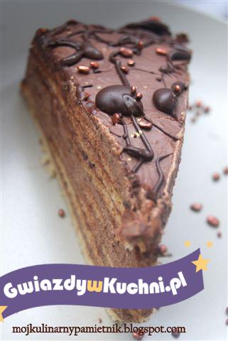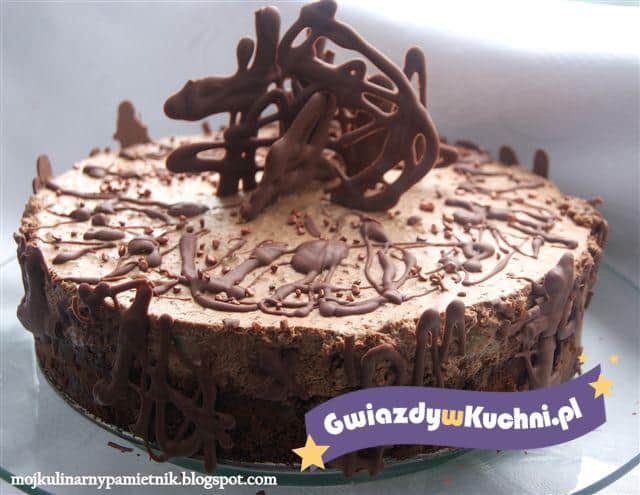 Przyrządzić ciasto biszkoptowe. Masło rozpuścić. Ostudzić. Oddzielić białka jajek od żółtek, białka ubić na sztywną pianę, stopniowo dodawać 150 g cukru, cukier waniliowy i sól, po czym starannie wymieszać. Żółtka utrzeć z 70g cukru na puszystą białą masę. Delikatnie połączyć z masą z białek. Przesiać na wierzch mąkę i wszystko wymieszać. Na końcu wmieszać rozpuszczone masło. Blachę do pieczenia z piekarnika wyłożyć papierem, na środek położyć zamkniętą obręcz z tortownicy o średnicy 26cm. Do obręczy nałożyć trochę masy i rozsmarować cienko na całej powierzchni, tak aby powstał okrąg o średnicy 26cm. (Krążek ma być cienki, mniej więcej jak naleśnik.) W ten sposób przygotować 7 krążków. Każdy krążek piec przez ok 8 min w 180st. Upieczone placki powinny być jasne i ewentualnie przyrumienione na bokach. Przygotować krem: Odlać 10 łyżek mleka, resztę zagotować. Wymieszać 10 łyżek mleka z budyniem i łyżka cukru. Gotujące się mleko zdjąć z ognia, dodać rozrobiony budyń z cukrem i stale mieszając doprowadzić do wrzenia. Do gorącego budyniu włożyć rozdrobnioną czekoladę i wymieszać aż się rozpuści. Uzyskaną masę ostudzić. Masło utrzeć mikserem. Dalej miksując, dodać stopniowo zimny budyń oraz rum. Placki cienko posmarować kremem maślanym, kładąc jeden na drugi i przekładając je kremem, pozostała masa posmarować wierzch i boki. Tort odstawić na 2 godziny w chłodne miejsce. Polewy rozpuścić oddzielnie. Do polewy gorzkiej dodać masło, doprowadzić również do rozpuszczenia. Jasną polewą równomiernie posmarować wierzch tortu, zakrywając wszelkie nierówności. Ciemną polewą wykonać dekoracje, która została na szybko wymyślona