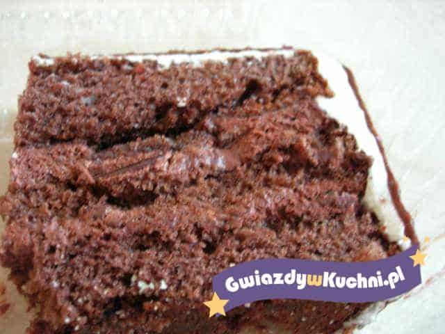 Masło roślinne utrzeć z żółtkami, cukrem i kakao. Nadal ucierając wsypać mąkę z proszkiem do pieczenia, wymie­szać, delikatnie połączyć ze sztywno ubitą pianą z białek. Ciasto wyłożyć do tortownicy wysmarowanej tłuszczem i posypanej tartą bułką. Piec około 40 min w piekarniku na­grzanym do 200°C. Po upieczeniu wystudzić, przekroić na dwa krążki. Miękkie masło utrzeć z serkiem i cukrem, do­dać esencję. Dolny krążek posmarować warstewką dżemu i połową kremu, przykryć drugim krążkiem. Wierzch i boki tortu posmarować lekko podgrzanym dżemem, a potem resztą kremu. Dowolnie udekorować, np. polewą czekolado­wą, owocami i tartą czekoladą