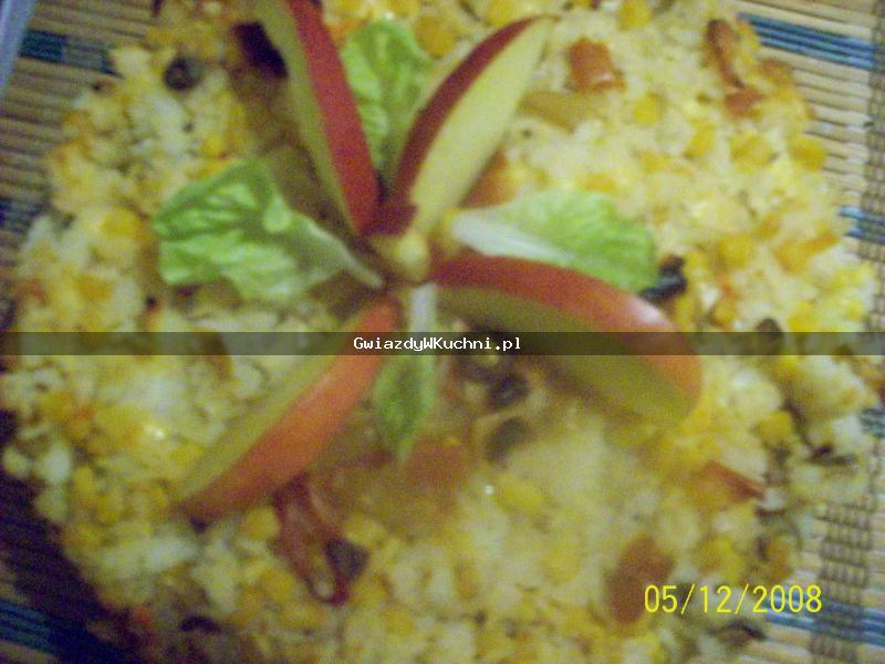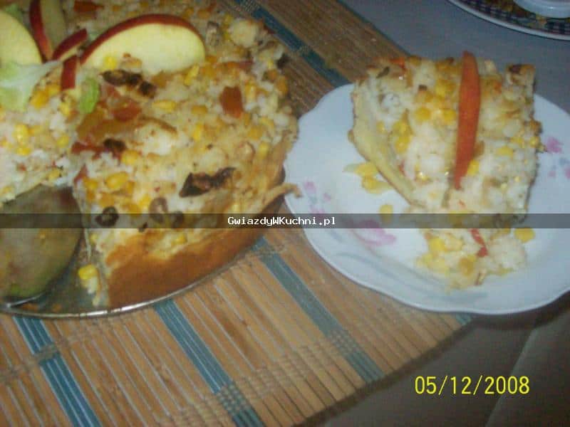 Ryż, cebulę, pepperoni, kukurydzę, oliwki, masło i starty ser delikatnie wymieszać.