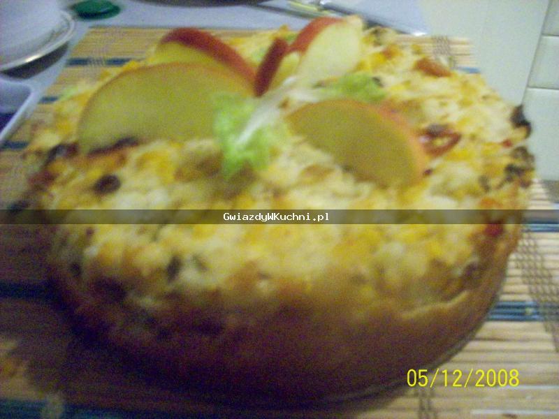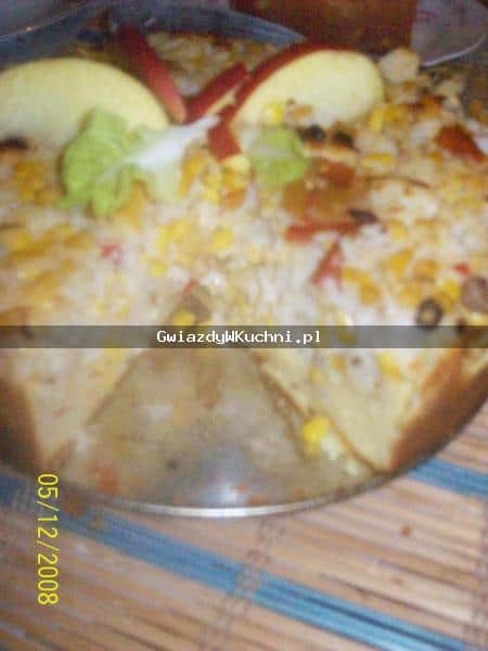 Na cieście rozłożyć ryż z warzywami i wyrównać powierzchnię.