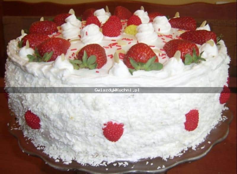 Posmarować jeden krążek masą przełożyć drugi i posmarować dżemem. Wierzch tort posmarować masą i udekorować truskawkami.