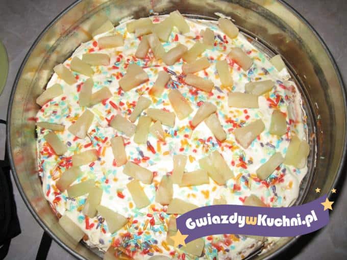 Białka z 6 jajek ubij z cukrem. W kubku przygotuj żółtka (6 sztuk) zmieszane z octem i proszkiem do pieczenia. Do białek dodaj żółtka, wymieszaj, dodaj mąkę i oliwę. Ciasto wylej na tortownicę. Po upieczeniu i wystudzeniu podziel na 3 części. Masło utrzyj z cukrem na pulchną masę, stopniowo dodawaj po 1 jajku. Krem podziel na 2 części do jednej dodaj kakao i wymieszaj. Wodę, 2 łyżki cukru, spirytus i sok z cytryny wymieszaj na poncz i nasącz nim biszkopt. Biszkopt przełóż kremem, na wierzchu białym. Galaretkę rozpuść w połowie wody przewidzianym w przepisie. Tężejącą galaretkę wylej na tort. Tort udekoruj ananasem.