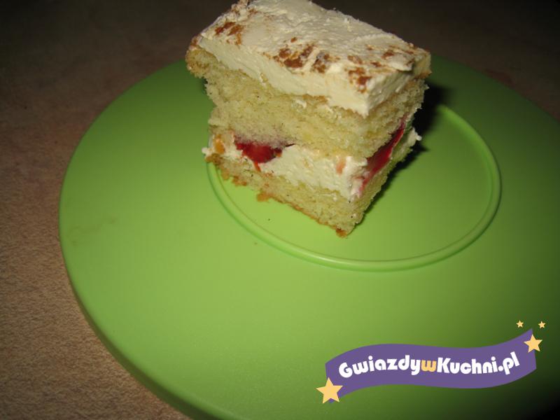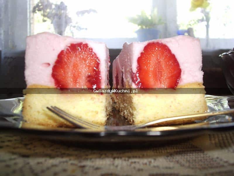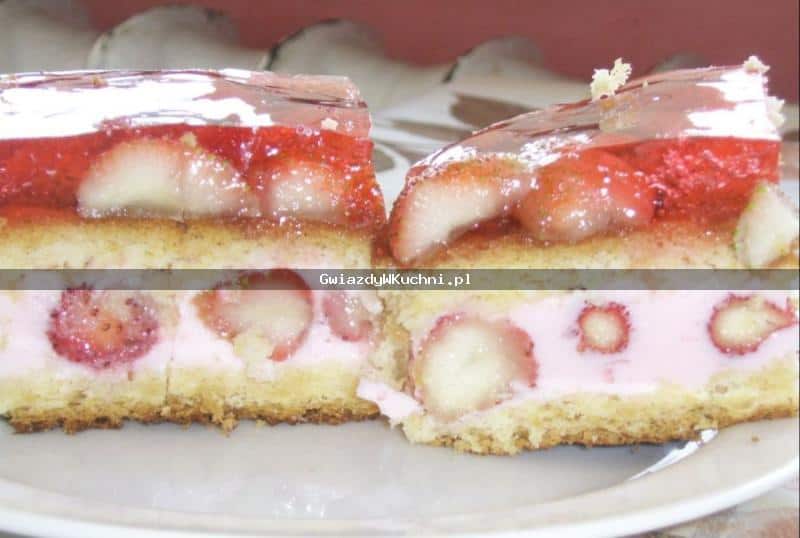 Wylać na biszkopt i przykryć drugą połową. Na wierzch poukładać truskawki i zalać galaretką. Wstawić do lodówki.