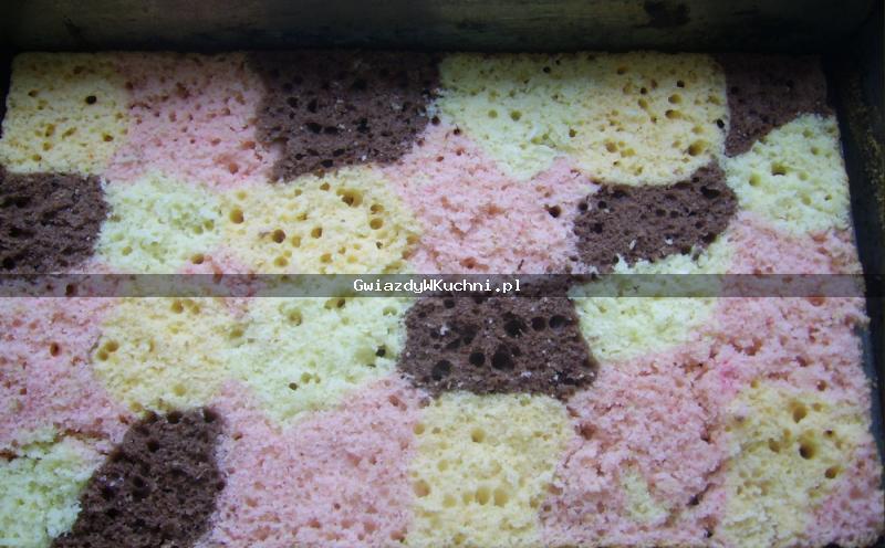 Ciasto dzielimy na cztery równe części, do pierwszej dodajemy kakao, do drugiej kisiel truskawkowy, do trzeciej kisiel brzoskwiniowy a do czwartej wiórki kokosowe.