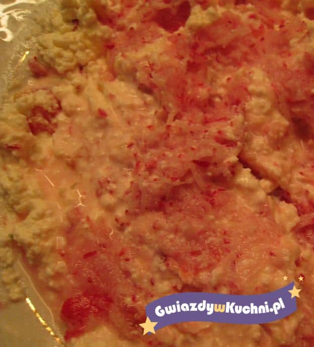 Ser biały rozgnieść widelcem, dodać starte na drobno rzodkiewki, śmietanę, sól i pieprz, wszystkie składniki dobrze wymieszać.