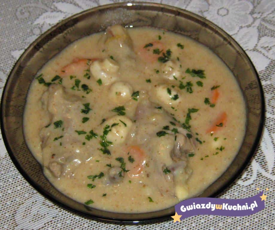 Mięso umyć, podzielić na połowy i obsypać przypraw kuchenną, obsmażyć na maśle. Podlać wodą i dusić. Marchew obrać, umyć i pokroić w plastry. Cebulę obrać i drobniutko pokroić. Dodać do mięsa. Oprószyć mąką i wymieszać. Mąki i wody dodać tyle by powstał sos. Dodać musztard ę i doprawić do smaku. Na koniec dodać śmietanę.