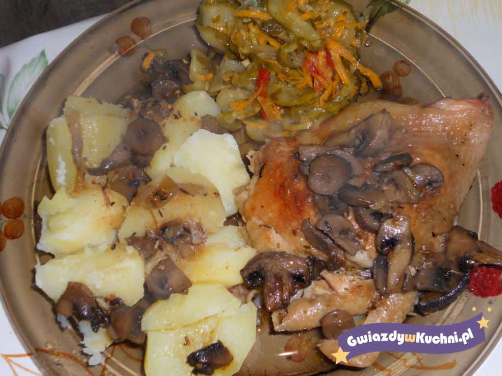 Udka umyć (można podzielić na części), oczyścić z tłuszczu a następnie natrzeć vegetą, solą, pieprzem i przeciśniętym przez praskę czosnkiem. W dusznicy rozgrzać trochę oleju i obsmażyć delikatnie mięso, następnie mięso podlać odrobiną wody i dusić pod przykryciem do miękkości mięsa od czasu do czasu obracając strony. Około 20 minut przed końcem duszenia do kurczaka wrzucić pieczarki pokrojone na kawałki. Całość chwilę jeszcze poddusić. Podawać z surówką i ziemniakami.