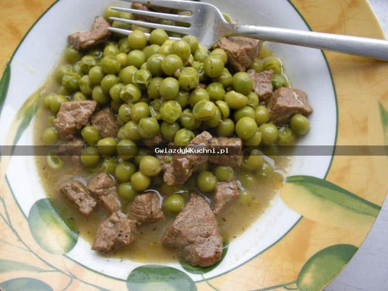 W rondelku gotuję 2 szklanki wody, dodaję kostkę rosołową, przyprawy i przekładam mięso. Gotuję, aż całość zmięknie. Pod koniec dodaję groszek i duszę około 5 minut.