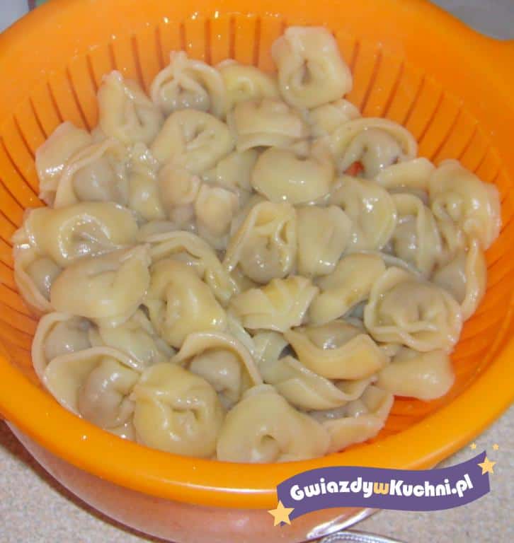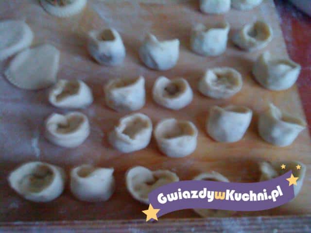 Z mąki, wody i soli należy wyrobić ciasto. Posiekane grzyby, jajka i cebulę należy chwilę smażyć z masłem, doprawić do smaku solą i pieprzem, wlać śmietanę, wymieszać. Ciasto cienko rozwałkować, pokrajać radełkiem na malutkie kwadraciki, na każdy nakładać po trochu farszu, zalepiać pierożki, łącząc dwa przeciwległe rogi. Gotować we wrzącej, lekko osolonej wodzie około 4 minuty od momentu ich wypłynięcia.