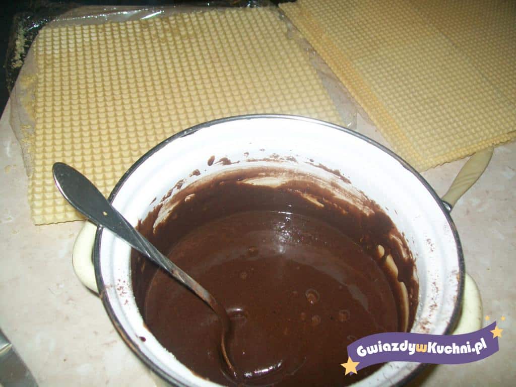 Mleko, masło, i cukier podgrzewamy w garnku do czasu uzyskania jednolitej masy. Zdejmujemy z płyty. Przestudzamy ok. 10 min. Miksując dodajemy mleko w proszku, kakao i aromat. Studzimy. Tężejącą masą smarujemy wafle.