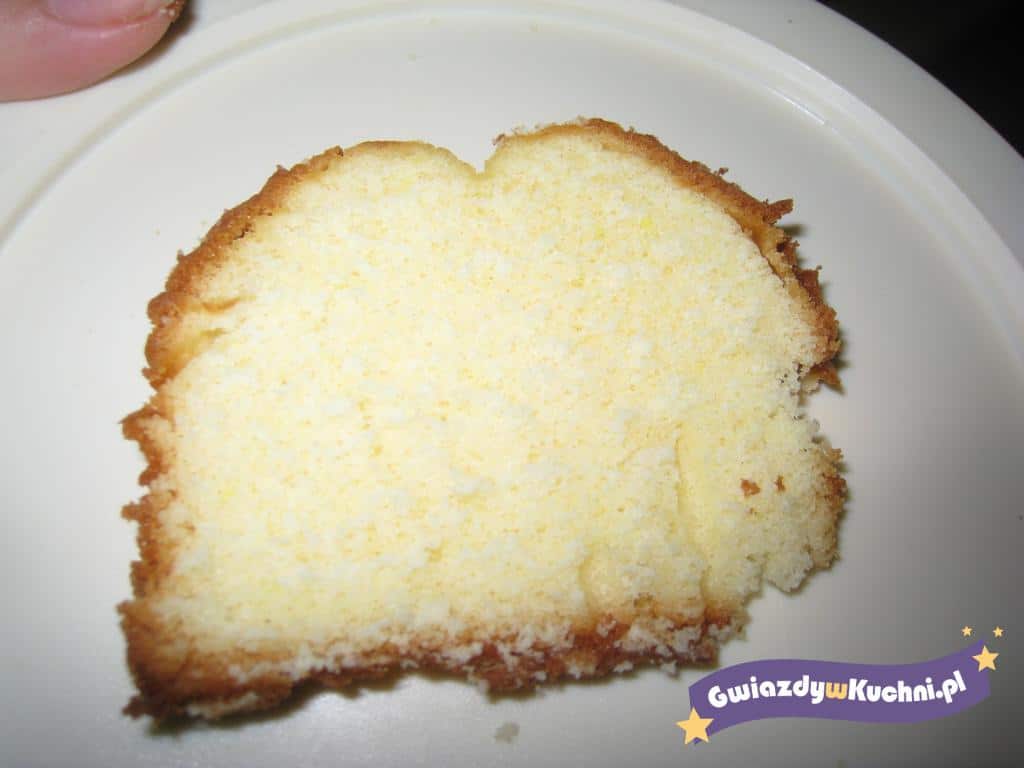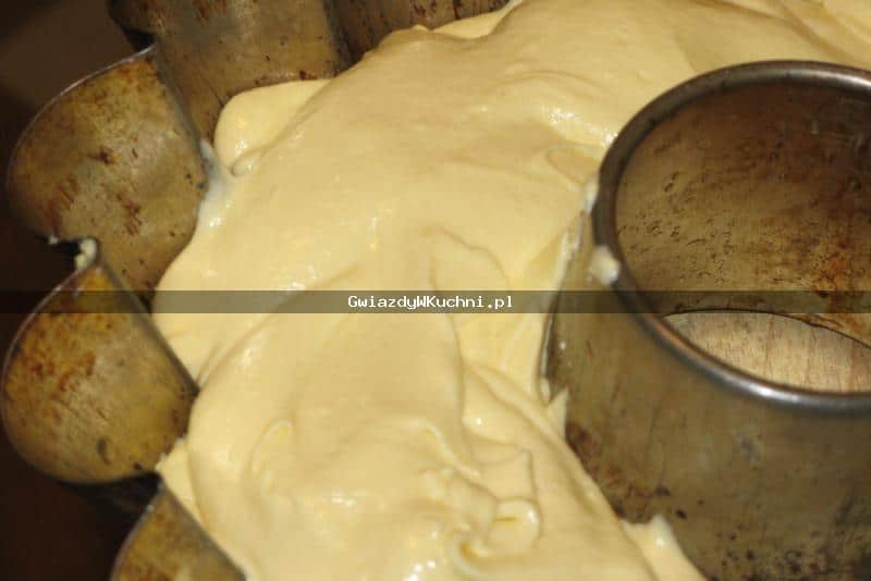 Do ubitych z cukrem jaj dodajemy ostudzona margarynę, nastepnie porcjami maki, a na koniec olejek.