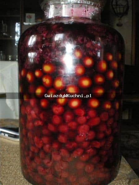 Wiśnie gotujemy, zlewamy powstały sok. Do soku dodajemy cukier, zagotowujemy. Do słoika układamy pierwsze wiśnie, mirabelki, wiśnie. Zalewamy sokiem. Pasteryzujemy w piekarniku w 100 stopniach, 10 minut.