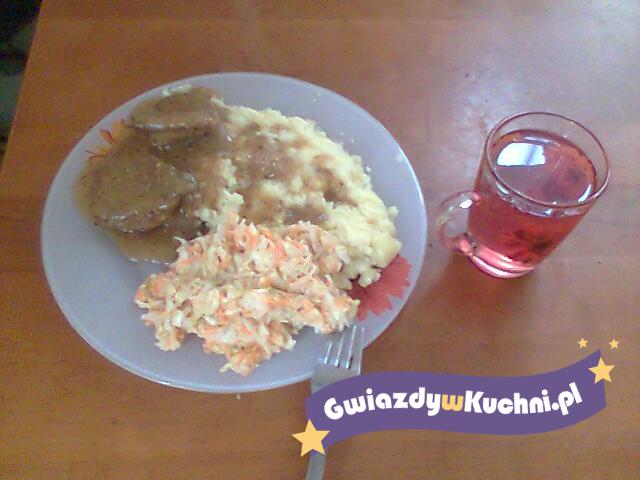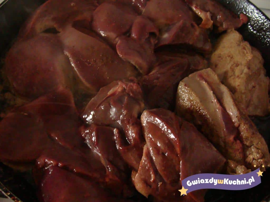 Wątróbkę umyć, osuszyć, pokroić w dużą kostkę . Na na połowie masła razem podsmażyć cebulę. Na patelnię dodać pozostałe masło i wątróbkę . Obsmażyć wątróbkę , podlać 3/4 szklanką bulionu i chwilę dusić, oprószyć solą lub vegetą i pieprzem , zagęścić mąką rozprowadzoną w pozostałym bulionie.