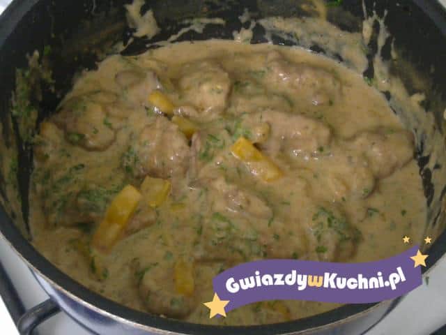 Oczyszczoną wątróbkę doprawić połową papryki, pieprzu ziołowego i dwiema szczyptami pieprzu czarnego. Wątróbki panierować w mace i obsmażyć na rumiano z obu stron. Dodać pokrojoną paprykę, cebulkę i smażyć przez ok. 5 minut. Potem podlać odrobiną gorącej wody i wlać śmietankę. Doprawić cukrem, solą, papryką słodką, pieprzem ziołowym i dusić na małym ogniu przez ok. 15 minut. Na koniec sos wymieszać z posiekaną zieleniną. Najlepiej smakują z kopytkami .