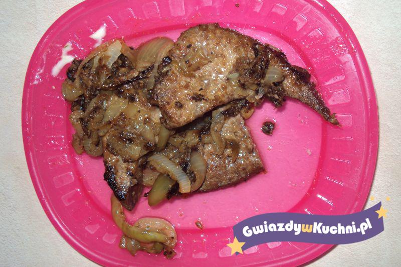 Wątróbkę myjemy, kroimy na mniejsze kawałki według swego uznania. Każdy kawałek taczamy w mące. Oliwę rozgrzewamy na patelni, układamy wątróbkę, smażymy na najmniejszym ogniu około 20 minut. Cebulkę obieramy, kroimy, dodajemy do wątróbki, na sam koniec doprawiamy przyprawami wątróbkę, mieszamy. Należy pamiętać aby na koniec doprawić przyprawami żeby wątróbka była miękka.