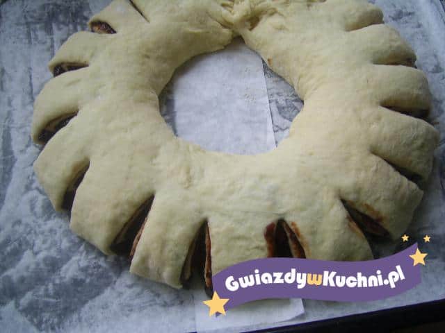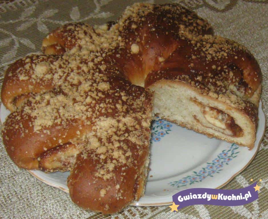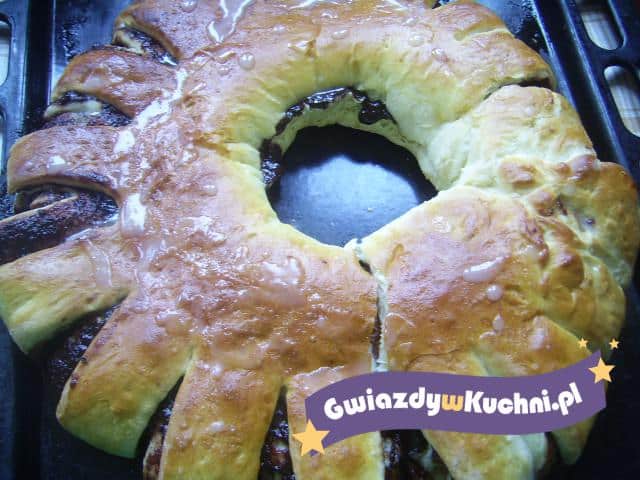 Drożdże rozpuścić w połowie mleka z cukrem, drugą część mleka bardziej podgrzać i rozpuścić w niej masło, przestudzić. Dodać pozostałe składniki i wyrobić dokładnie ciasto (w razie potrzeby dosypać mąki). Zostawić do wyrośnięcia. Ciasto po wyrośnięciu rozwałkować na prostokąt 25×45 cm, posmarować powidłami. Zwinąć ciasto w roladę, zlepić dwa końce tak, aby uformować okrąg. Ułożyć na blasze i ponacinać brzegi jak na zdjęciu. Odstawić do wyrośnięcia, posmarować roztrzepanym jajkiem, wstawić do nagrzanego piekarnika i upiec na rumiano w tem. 180* około 30-35minut. Po ostygnięciu można polukrować.