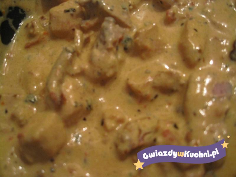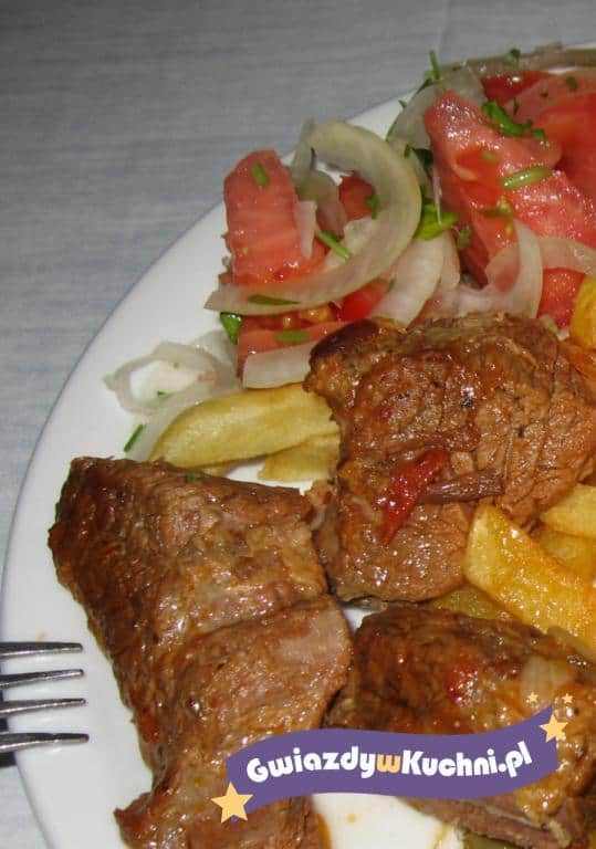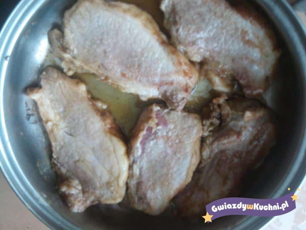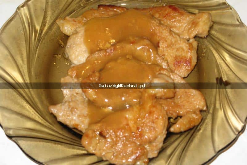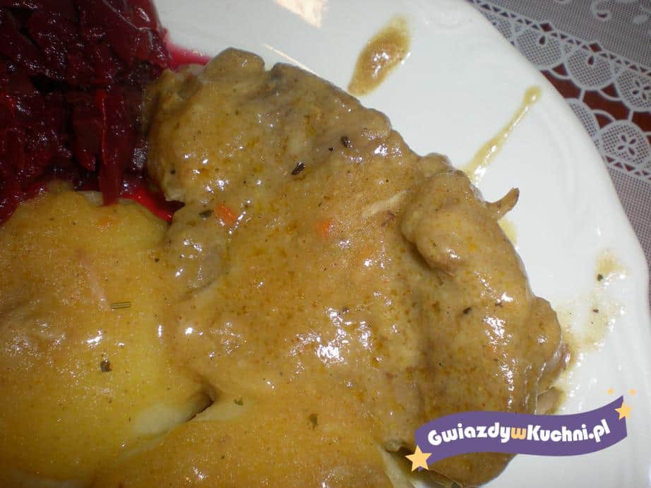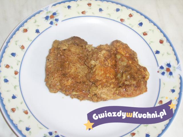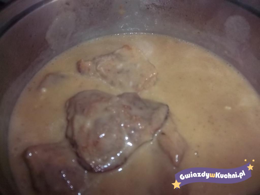 Mięso pokroić na kawałki i rozbić. Cebulę pokroić w kostkę i podsmażyć na tłuszczu, dodać mięso i chwilę smażyć po czy zalać rosołem. Dusić ok. 30min. Wyjąć mięso a rosół wymieszać z mąką na sos.