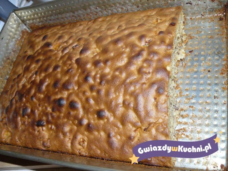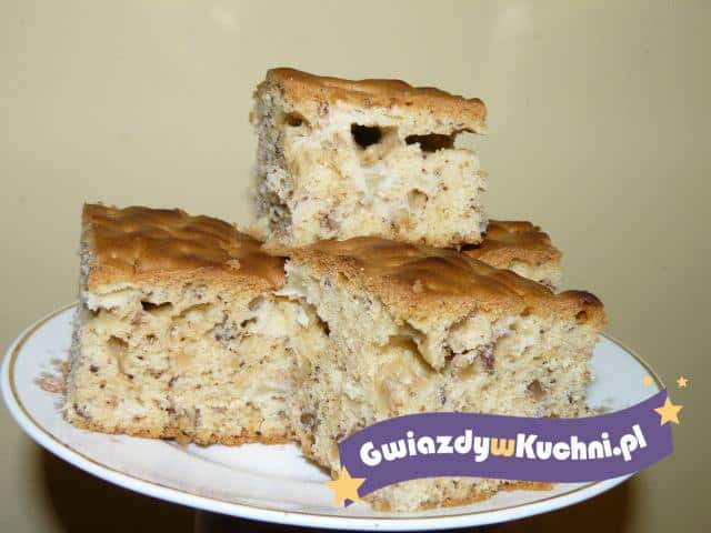 Jajka ubić z cukrem, starannie wymieszać z mąką, sodą i proszkiem do pieczenia. Nadal mieszając wlewać bardzo powoli oliwę. Jabłka pokroić w kostkę. Dokładnie wymieszać ciasto z orzechami i jabłkami. Do wysypanej bułką tartą formy przełożyć ciasto i wstawić do piekarnika nagrzanego do 180 stopni c – piec 40 minut.