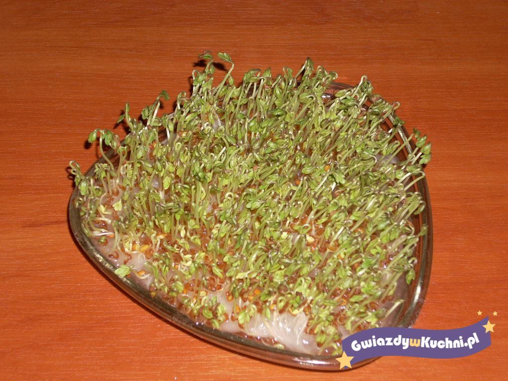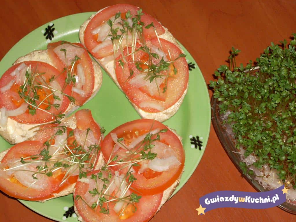 Pieczywo opiekamy w opiekaczu, smarujemy świeżym śmietankowym masełkiem. Pomidory myjemy, osuszamy i kroimy w plastry, układając je na przygotowanym pieczywie. .na każdej kromeczce – na pomidorku układamy dwa piórka lub więcej cebulki i posypujemy świeżą wyhodowaną przez siebie rzeżuchą.