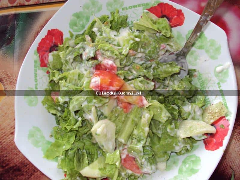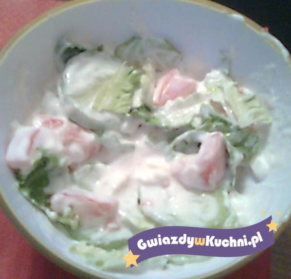 Jogurt musi być zimny z lodówki, dodajemy do niego sól i pieprz. Mieszamy do momentu, aż się równomiernie rozmiesza. Sałatę, pomidory, ogórki myjemy, suszymy na ręczniku papierowym. Sałatę drobnimy palcami, pomidory i ogórki kroimy nożem w kostkę. Mieszamy warzywa ze sobą i na koniec dodajemy jogurt z pieprzem i solą.