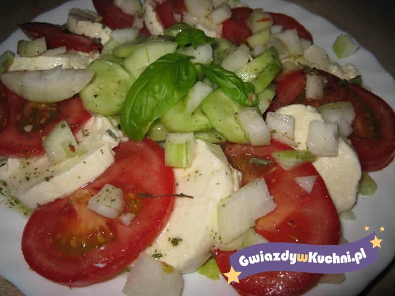Pomidor parzymy i obieramy ze skórki, kroimy na plasterki. Ogórek i ser kroimy na plasterki. Wykładamy na talerz warzywa i ser, można na przemian lub według uznania. Cebulkę obieramy i kroimy na małe kawałki i posypujemy nim sałatkę. Przygotowujemy sos do polania. Oliwę z oliwek łączymy z bazylią suszoną i pieprzem. Polewamy sałatkę sosem. Solimy. Dekorujemy bazylią świeżą.