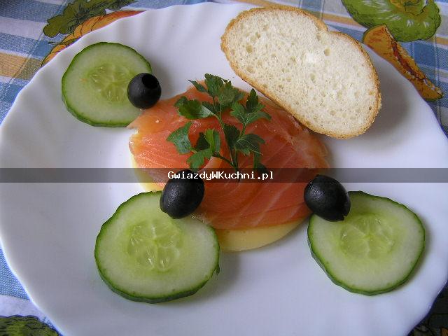 Plastry sera posypujemy ziołami. Rozmącamy jajko. Panierujemy plastry sera w jajku, tartej bułce, smażymy na gorącym tłuszczu z obu stron na złoty kolor. Na kromkach pieczywa układamy plastry sera i łososia. Dekorujemy ogórkiem i natką pietruszki.
