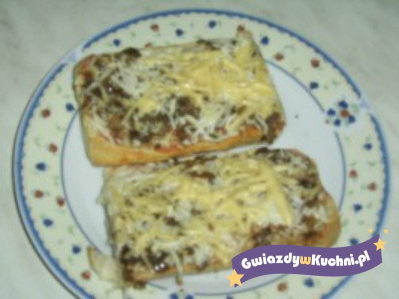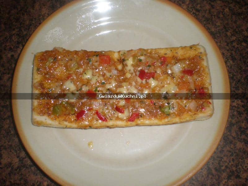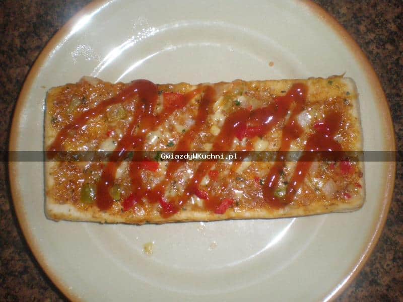 Gotowe ciasto do pizzy dzielimy na 4 części. Pieczarki oczyszczone i pokrojone w cienkie plasterki smażymy na maśle na rozgrzanej patelni do momentu aż będą miękkie. Cebulę smażymy na jednej łyżce masła na patelni do momentu jej zeszklenia. Ser żółty ścieramy na tarce o grubych oczkach. Natkę pietruszki bardzo drobno siekamy. Poszczególne części ciasta do pizzy smarujemy keczupem, nakładamy na nie pieczarki i zeszkloną cebulę, posypujemy posiekaną w drobniutka kostkę papryką, natką pietruszki, serem żółtym i przyprawami, wstawiamy do mikrofalówki na 15 minut w celu podgrzania, podajemy z keczupem.