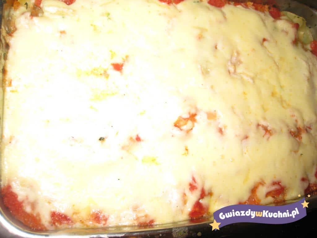 Mięso pokrój w kostkę, podsmaż na oleju. Wymieszaj z warzywami oraz połową startego sera, dopraw, przełóż do naczynia żaroodpornego. Jajka zmieszaj z mlekiem i śmietaną, polej zapiekankę. Posyp pozostałym tartym serem. Zapiekaj 35 minut w temp 200*c.