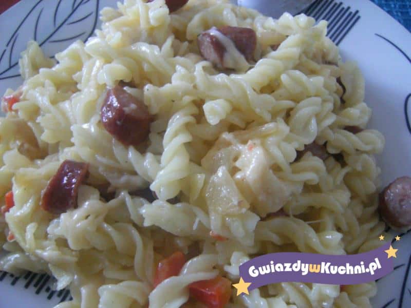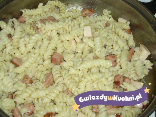 Cebule podsmażyć razem z kiełbasą. Makaron zmieszać z cebulą oraz z kiełbasą, oprószyć solą i pieprzem, dokładnie wymieszać. Brytfannę wysmarować tłuszczem, posypać bułką, wyłożyć masę, skropić tłuszczem i zapiec w 175 stop. Po upieczeniu podzielić na porcję, podawać z sosami, posypać zieleniną.