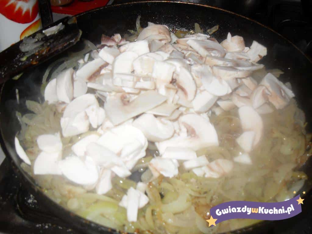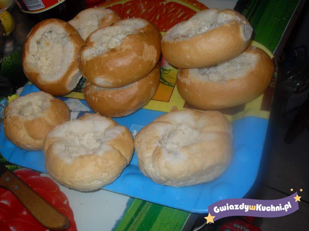 Cebulę obieramy i kroimy w piórka. Pieczarki po umyciu kroimy w cienkie półplasterki. Cebulę wrzucamy na rozgrzany olej (3 łyżki), szklimy ją lekko i dokładamy pokrojone pieczarki i razem dusimy do złotego koloru. Pod koniec duszenia posypujemy do smaku solą pieprzem oraz dodajemy swoje ulubione zioła (ja dodałam zioła prowansalskie). Podczas przygotowywania farszu przygotowujemy bułeczki. Ścinamy górną część bułek, wydrążamy środek pozostawiając ok 1 cm warstwę miękiszu w bułeczce. Mleko łączymy z wodą dodajemy do tej mieszaniny odrobinę soli i ziół. Wlewamy po ok 1 łyżce mieszaniny mlecznej do każdej bułeczki. Każdą bułeczkę napełniamy farszem pieczarkowym, posypujemy posiekaną natkę i na wierzch dajemy starty żółty ser. Wstawiamy do piekarnika nagrzanego do 150 – 160 stopni c. I zapiekamy około 10 – 12 minut – do chwili stopienia się sera. Po wyjęciu z piekarnika na wierzch zapiekanki dajemy po małej łyżeczce sosu duńskiego, i majonezu i robimy kleksy z ketchupu.