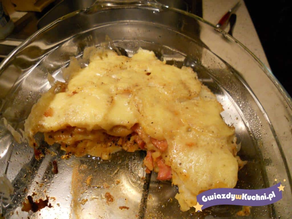 Ziemniaki obrać, umyć i ugotować w osolonej wodzie (na półtwardo). Odcedzić, ostudzić i pokroić w plastry. Kiełbasę pokroić w plastry i podsmażyć na oleju. Cebulę obrać pokroić w piórka i podsmażyć na łyżce masła. Naczynie żaroodporne posmarować masłem, wyłożyć 1/3 ziemniaków, posypać przyprawami według uznania. Na ziemniaki wyłożyć połowę kiełbasy i cebuli, na to znowu warstwę kiełbasy, przyprawy i resztę kiełbasy i cebuli. Na to ostatnia warstwa ziemniaków i przypraw. Na wszystko zetrzeć żółty ser. Całość zapiekać ok 30 minut w piekarniku nagrzanym do 180c.