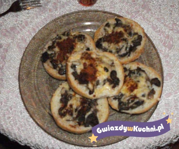 Cebulę obrać i pokroić. Pieczarki pokroić w plasterki i usmażyć z cebulą. Ser zetrzeć na tarce o grubych oczkach. Bułki przeciąć na pół. Obie papryki wymieszać. Na bułkę nałożyć pieczarki i posypać serem. Na koniec pokruszyć bazylie i posypać nią i paprykami.