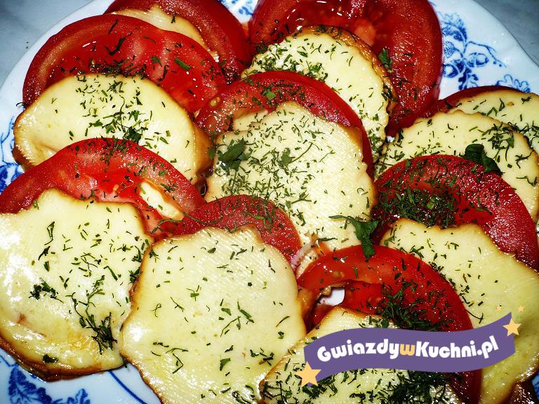 Oscypek przemyć i osuszyć papierowym ręcznikiem. Pokroić na grubsze plasterki. Pomidory opłukać i osuszyć. Pokroić na grubsze plasterki. Poukładać w blaszce naprzemiennie. Plasterki pomidora na nie plasterki oscypka. Wszystko posypać szczyptą soli i pieprzu. Na wierzch obsypać koperkiem i pietruszką. Zapiekać chwilkę w piekarniku. Przekładać na talerzyki.