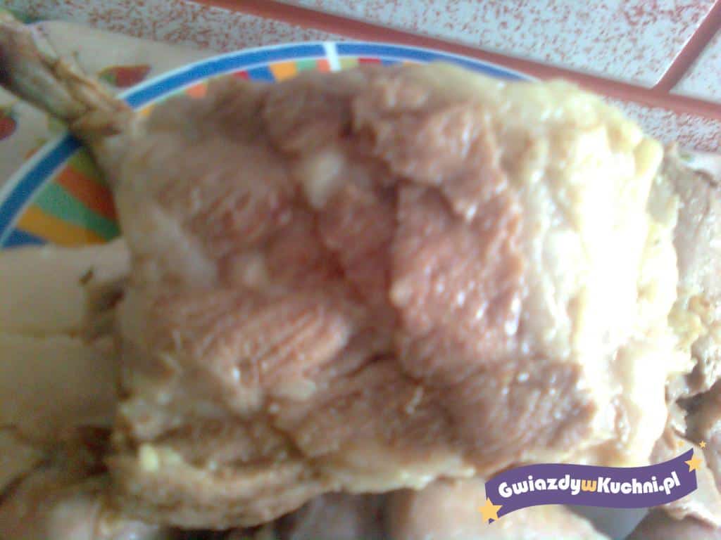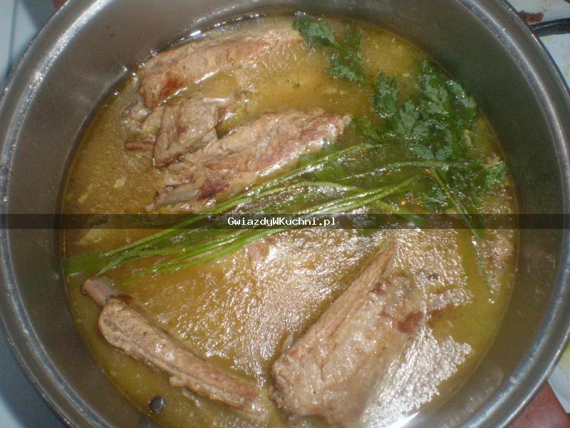 Żeberka należy dokładnie umyć i podzielić na porcje, na patelni należy rozgrzać tłuszcz i smażyć w nim żeberka z obu stron na lekko brązowy kolor. W garnku należy zagotować wodę, wrzucać do niej usmażone żeberka, marchewkę należy dokładnie umyć i oskrobać, a następnie pokroić w plasterki i wrzucić do garnka z żeberkami. Należy zmieszać ze sobą śmietanę i mąkę, następnie dodać trochę wody, zahartować wrzątkiem i dodać do żeberek. Żeberka wymieszać, doprawić przyprawami. Gotować łącznie około 40 minut.