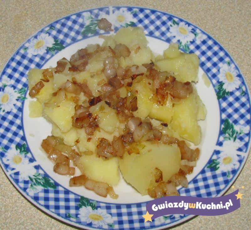 Ziemniaki wyłożyć na talerz, polać gorącym tłuszczykiem, podawać do mleka z lodówki lub do zsiadłego mleka.