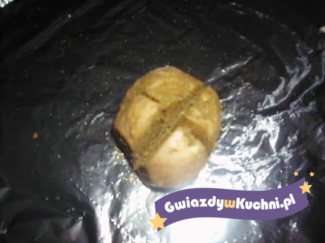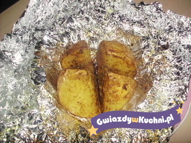 Ziemniaki /koniecznie równej wielkości – aby razem się upiekły/ dokładnie szorujemy i nakłuwamy np. widelcem. Folię aluminiową tniemy na kawałki i smarujemy /od strony bardziej błyszczącej/ olejem. Wszystkie przyprawy mieszamy. Ziemniaki nacinamy na pół lub na ćwiartki ale nie przekrawamy całkowicie, posypujemy mieszanką przypraw, przekładamy na folię aluminiową, skrapiamy olejem i delikatnie formujemy z foli „paczuszki” – tak aby folia nie pękła. Pieczemy w piekarniku nagrzanym do 180-190 stopni c ok. 50-60 min. Jeśli chcemy skrócić czas pieczenia ziemniaków możemy je obgotować w osolonym wrzątku, odsączyć, osuszyć, przekroić, oprószyć przyprawami, zawinąć w natłuszczoną folię i piec w piekarniku ok. 20-30 min.