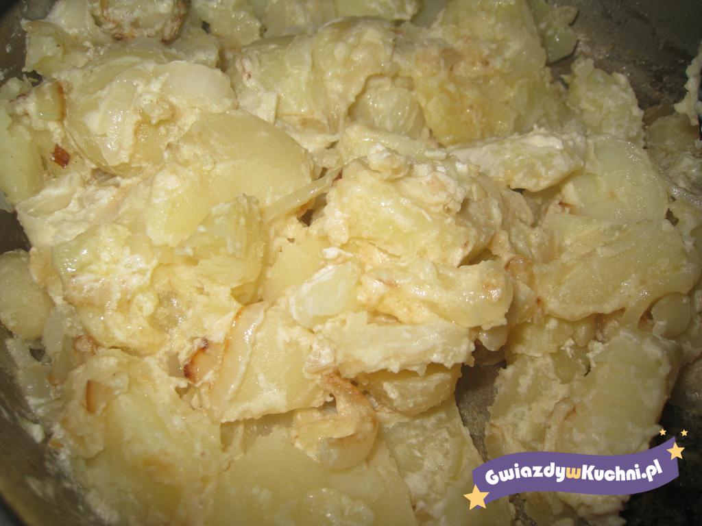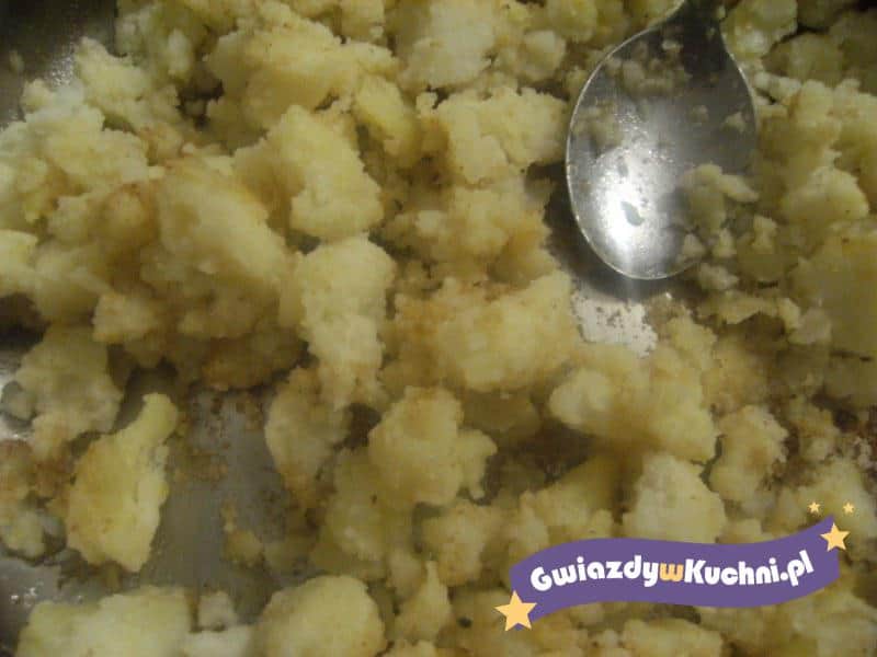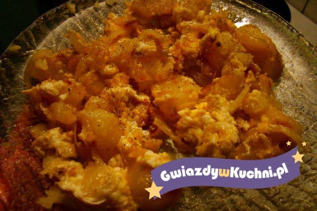 Pokrojone ziemniaki dajemy na rozgrzane masło smażymy dodajemy cebulkę pokrojoną w piórka. Potem zalewamy rozbitymi jajkami doprawiamy maga w płynie.