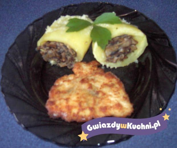 Cebulę pokroić cienko na piórka, podsmażyć. Dodać poszatkowane cienko pieczarki. Smażyć aż odparuje woda, dodać przyprawy. Na koniec jak lekko przestygnie dodać jajko. Ziemniaki obrać, przekroić na połówki i wydrążyć. Nałożyć wcześniej przygotowany farsz i ustawić w garnku farszem do góry. Zalać 3/4 wysokości ziemniaków, wodę osolić i gotować pod przykryciem ok 25 min. Podawać do wszelkiego rodzaju mięs.
