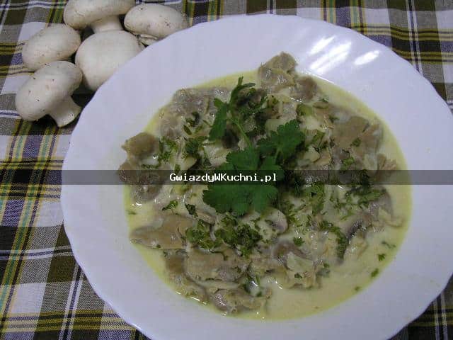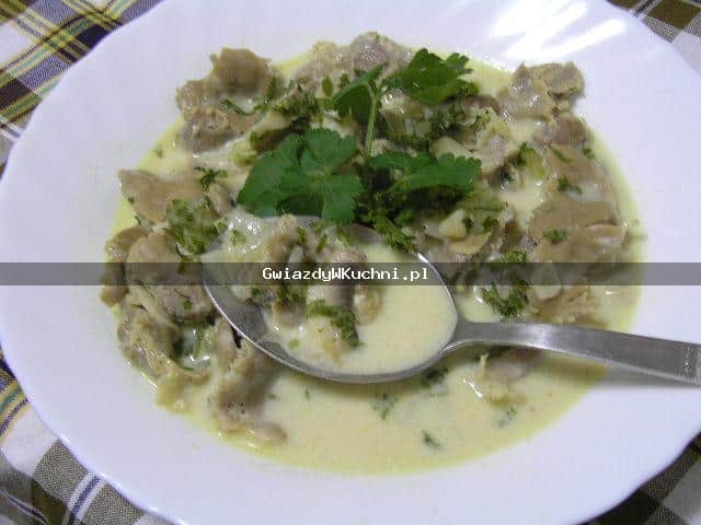 Żołądki oczyścić z błon, gotować w osolonej wodzie 1,5 do 2 godzin. Cebulę pociąć w drobną kostkę, pieczarki w plastry następnie dusić na patelni, często mieszając. Śmietanę rozprowadzić w naczyniu, dodać część wywaru i łyżkę mąki. Wszystkie składniki rozetrzeć, by nie było grudek. Całość wlać do garnka, chwilę pogotować. Natkę pietruszki drobno pociąć, zostawiając gałązkę do dekoracji.