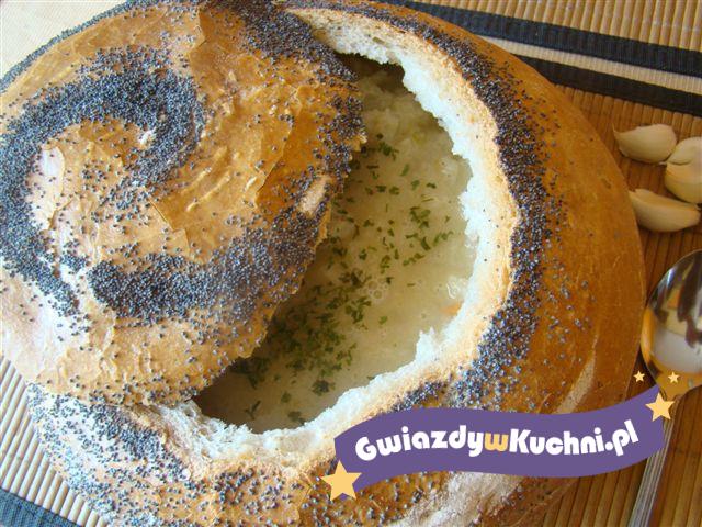 Przygotowuję sobie bazę czyli chleb. Odkrajam wierzch chleba i wybieram miękisz ale nie cały, na bokach ma zostać tyle żeby chleb nie przemókł gdy będzie w nim zupa i żeby jedzący z niego mogli go sobie wybierać łyżką razem z zupą. Cebulę i czosnek siekamy, szklimy na oleju. Gotujemy wywar (albo rosół albo z kostki). Wrzucam miękisz chleba, dodaję przesmażoną cebulę z czosnkiem. Następnie gorącą przelewam zupę do miksera gdzie ją miksuję, wbijam jajka i jeszcze raz szybko miksuje żeby się nie ścięły. Przyprawiam pieprzem i wegetą jeśli jest taka potrzeba. Jeśli zupa wydaje mi się za mało czosnkowa to wrzucam do niej posiekane 1-2 ząbki czosnku i jeszcze raz miksuje wszystko. Ma mieć fajny czosnkowy smak ale nie ostry więc nie przeciskam czosnku przez praskę tylko siekam na kawałeczki nożem. Wlewam do chleba, sypię natką i gotowe.
