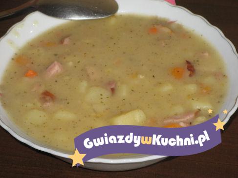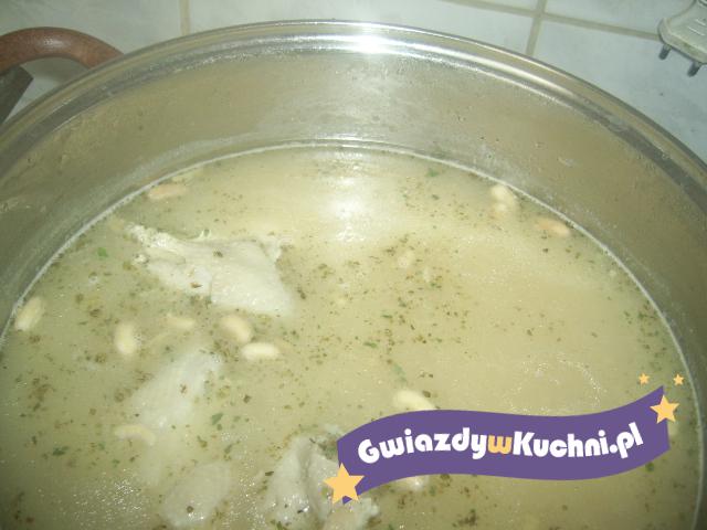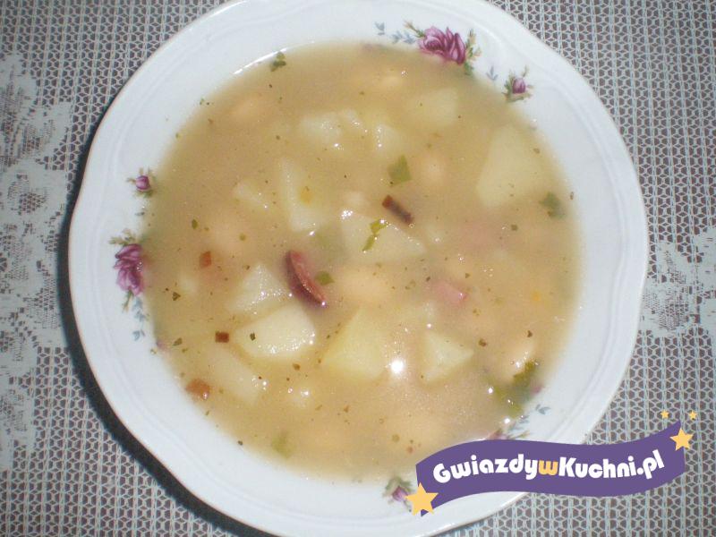 Fasolę namoczyć (najlepiej cała noc). Następnie ugotować w tej samej wodzie, w której się moczyła. Marchew, seler, cebulę i czosnek obrać i pokroić w kostkę. Łazanki ugotować na półtwardo w delikatnie osolonym wrzątku. Do garnka wlać 2 litry zimnej wody. Włożyć do środka umyta wołowinę oraz listek laurowy. Doprawić solą i pieprzem. Gotować na wolnym ogniu, od czasu do czasu szumując. Kiedy mięso będzie już miękkawe, dodać warzywa i gotować jeszcze 20 minut. Następnie wyjąć mięso, lekko ostudzić, pokroić w kostkę i wraz z fasolą dodać do zupy. Po zagotowaniu połączyć zupę z makaronem. Posypać natką pietruszki podawać.