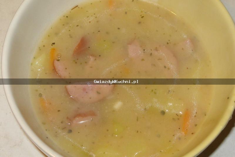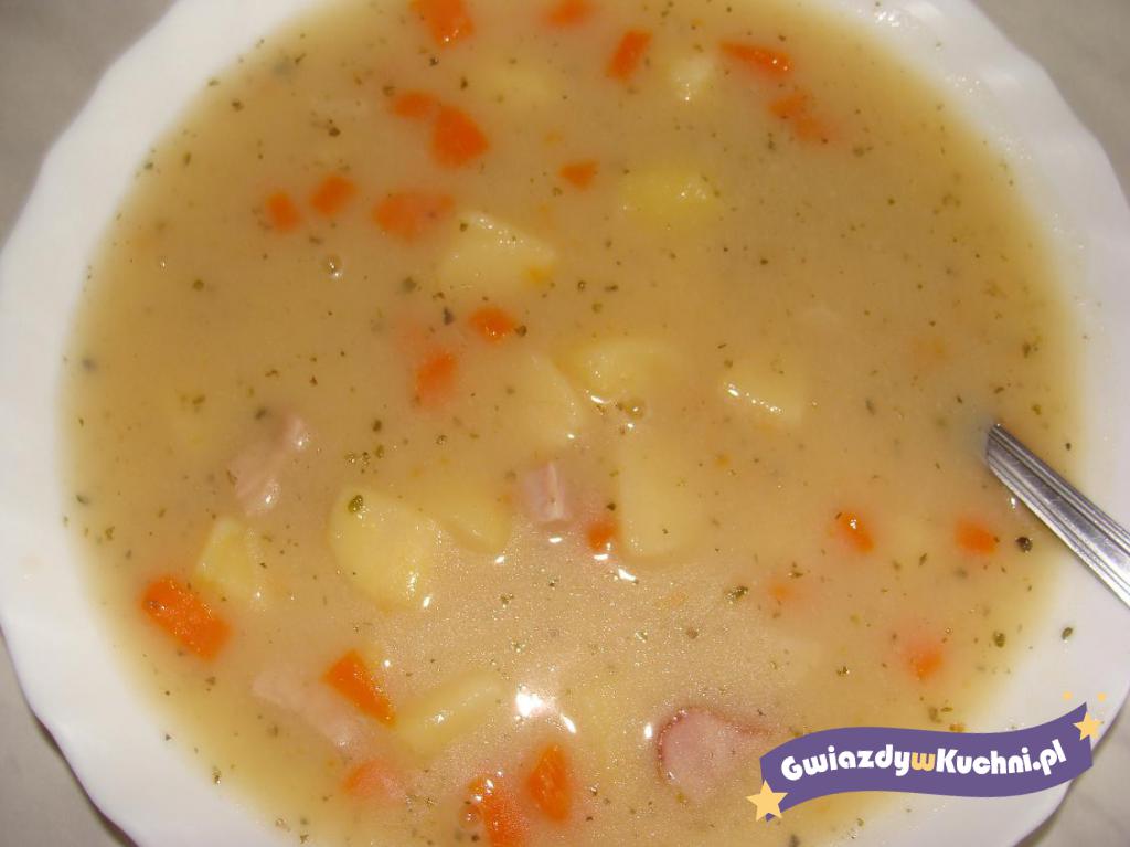 Warzywa obrać i pokroić w kostkę. Wodę zagotować, dodać warzywa i gotować aż będą miękkie. Kiełbasę pokroić dowolnie i dodać do warzyw. Zupę w proszku rozprowadzić w pół szklanki wody i wlać do warzyw, doprawić majerankiem. Gotować ok 10min.
