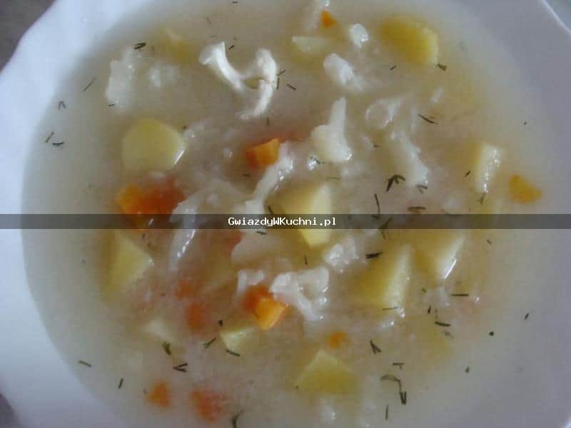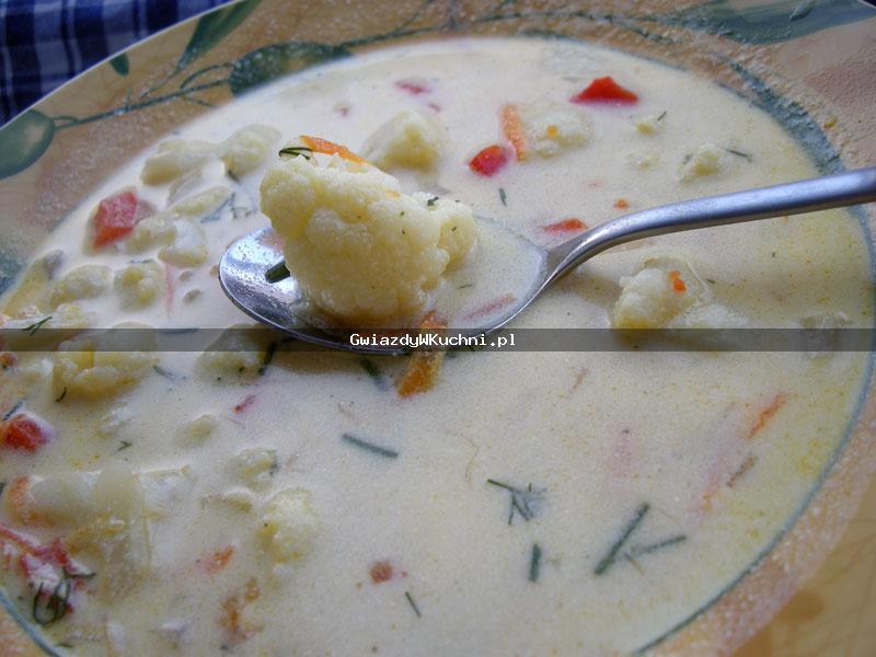 Kalafior wymyć z dodatkiem octu, pokroić na różyczki, włożyć do osolonego wrzątku i gotować do miękkości. Z mąki i masła zrobić jasną zasmażkę, połączyć z zupą i zagotować. Rozbełtać żółtka ze śmietaną i przed samym podaniem połączyć z zupą. Nie gotować.