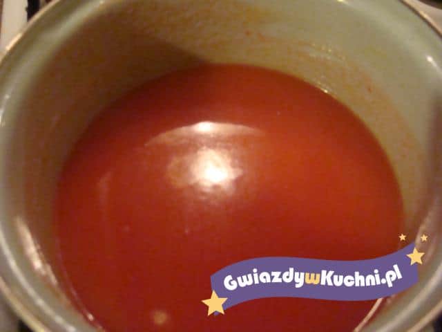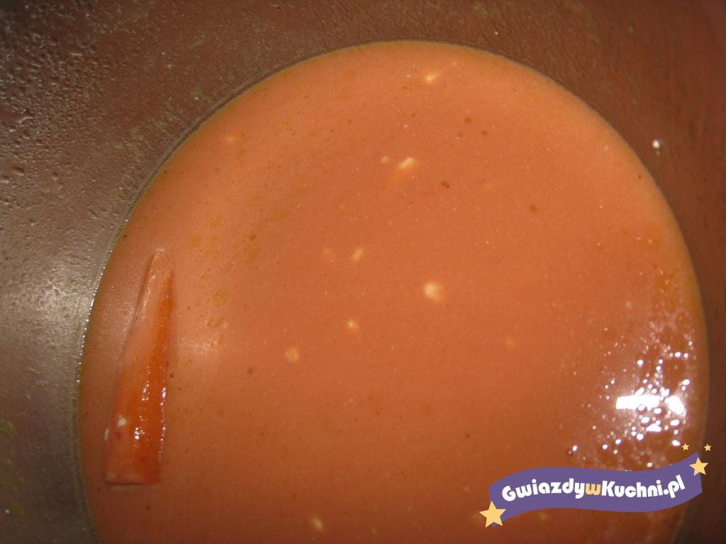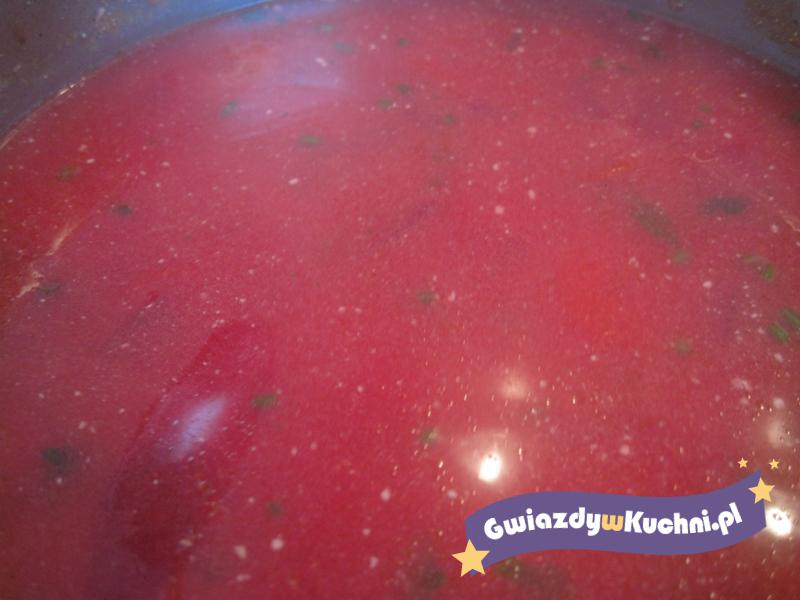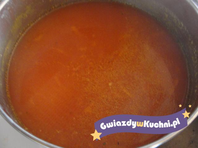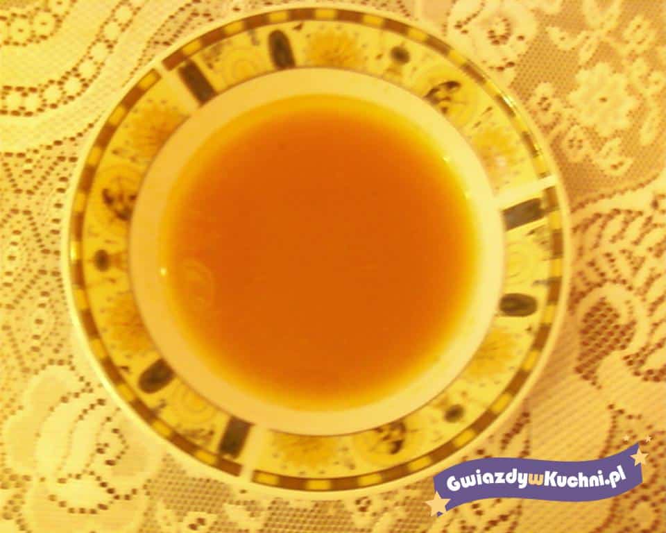 Z mięsa i warzyw dokładnie umytych i oczyszczonych ugotować wywar i przecedzić. Pomidory umyć, pokrajać w ćwiartki i udusić pod przykryciem z dodatkiem tłuszczu. Przyprawić solą, pieprzem i cukrem. Podawać z pasztecikami, francuskim lub groszkiem ptysiowym.
