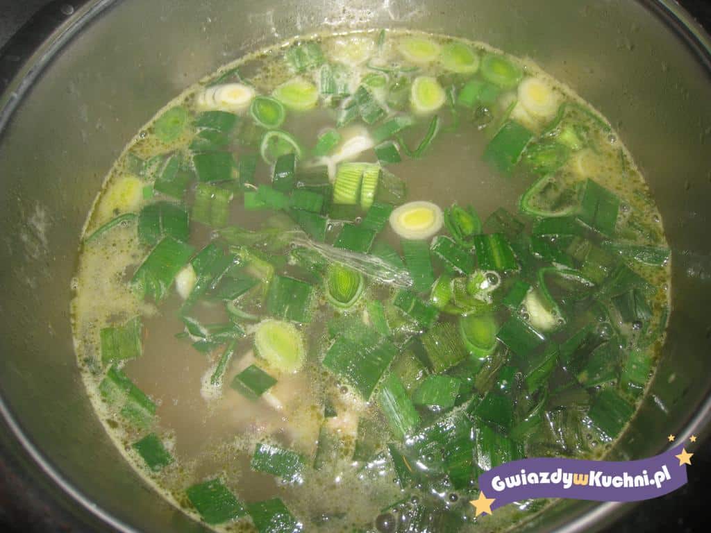 Kości ugotować w zimnej wodzie, wywar przecedzić. Warzywa obrać, umyć, rozdrobnić, zalać gorącym wywarem i ugotować. Pory pokrajać w kawałki. Ziemniaki obrać, opłukać pokrajać w kostkę, ugotować razem z warzywami. Przygotować zasmażkę z mąki i tłuszczu, dodać do wywaru i zagotować, przyprawić do smaku solą i pieprzem. Przed wydaniem posypać posiekaną natką pietruszki.