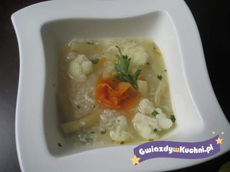 Mięso myjemy i wrzucamy do garnczka z wodą. Zagotowujemy wodę i wylewamy ją, wlewamy nową. Seler i pietruszkę obieramy i przecieramy na tarce jarzynowej o grubych oczkach, wrzucamy do garnczka z wodą. Gdy mięso będzie miękkie dodajemy kalafiora i fasolkę i ryż. Marchewkę obieramy i kroimy obieraczką na długie cienkie pasy i również dodajemy do zupy. Przyprawiamy do smaku. Uważamy, żeby marchewka się nie rozgotowała. Zupę wylewamy na talerze, na środek przybieramy marchewką skręconą w różę, posypujemy natką pietruszki.