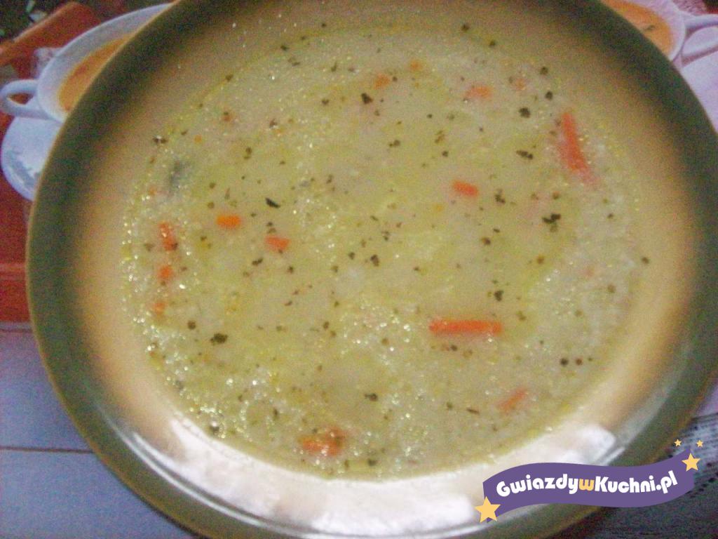 Wlej do garnka pół szklanki wywaru mięsnego. Zetrzyj na tarce o dużym ostrzu pół jabłka, pokrój w kostkę ziemniaki i dodaj do wywaru. Dorzuć też mały listek laurowy i gotuj, stopniowo dodając resztę wywaru. Przygotowujemy sos serowy: w małej miseczce rozetrzyj na gładką masę kostkę serka topionego (bez dodatków) z gorącą wodą. Pod koniec gotowania, gdy ziemniaki będą miękkie, a jabłko całkiem rozgotuje, wlej do zupy sos serowy, całość zagotuj i wyłącz. Dopraw solą pieprzem. Zupa świetnie smakuje z chrupiącą bagietką albo grzankami. Smacznego